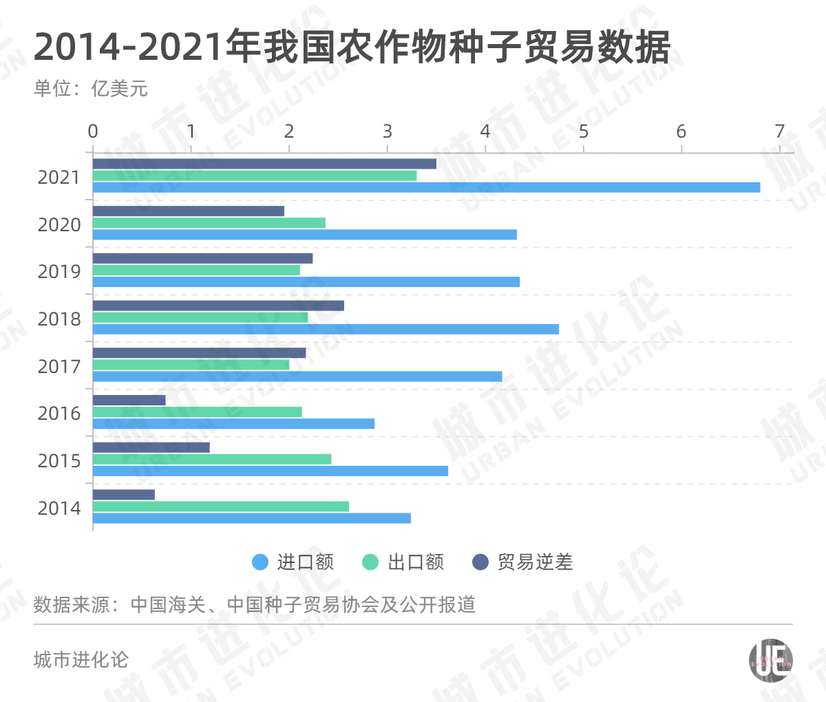 与此同时,2021年,我国农作物种子贸易额10.1亿美元,其中进口6.8亿美元,出口3.3亿美元,贸易逆差为3.5亿美元。