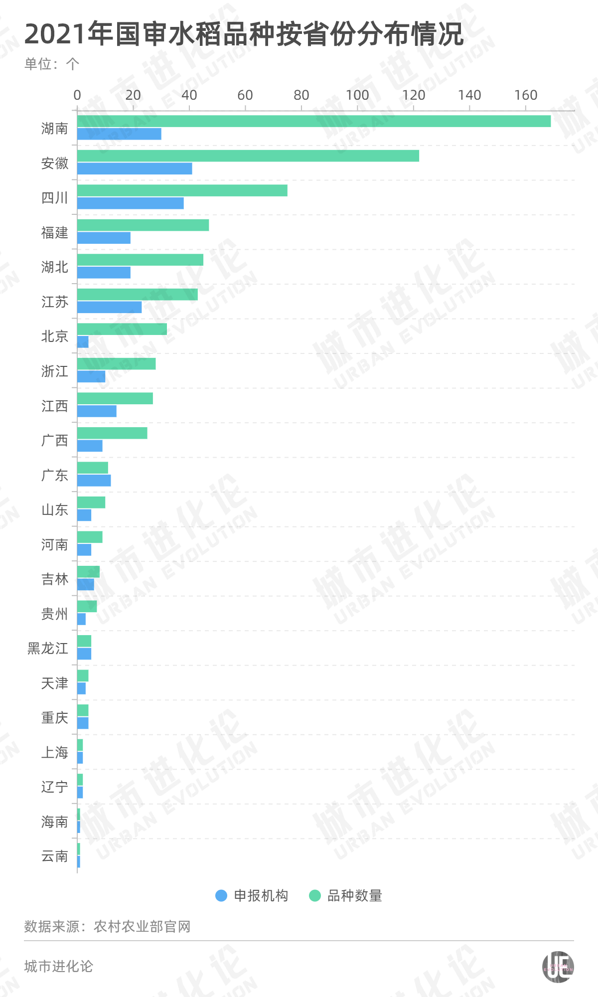 水稻种是我国最出名的出口优势种之一,去年出口额达9510万美元,占种子出口总额28.8%。同年,通过国审水稻品种共677个,仅湖南一省就有169个品种,居各省份首位,其中,袁隆平农业高科技股份有限公司通过了61个品种,占比达36%。然而,湖南通过申报的机构数量并非最高——安徽、四川两省分别以41、38位列第一、第二,湖南屈居第三。