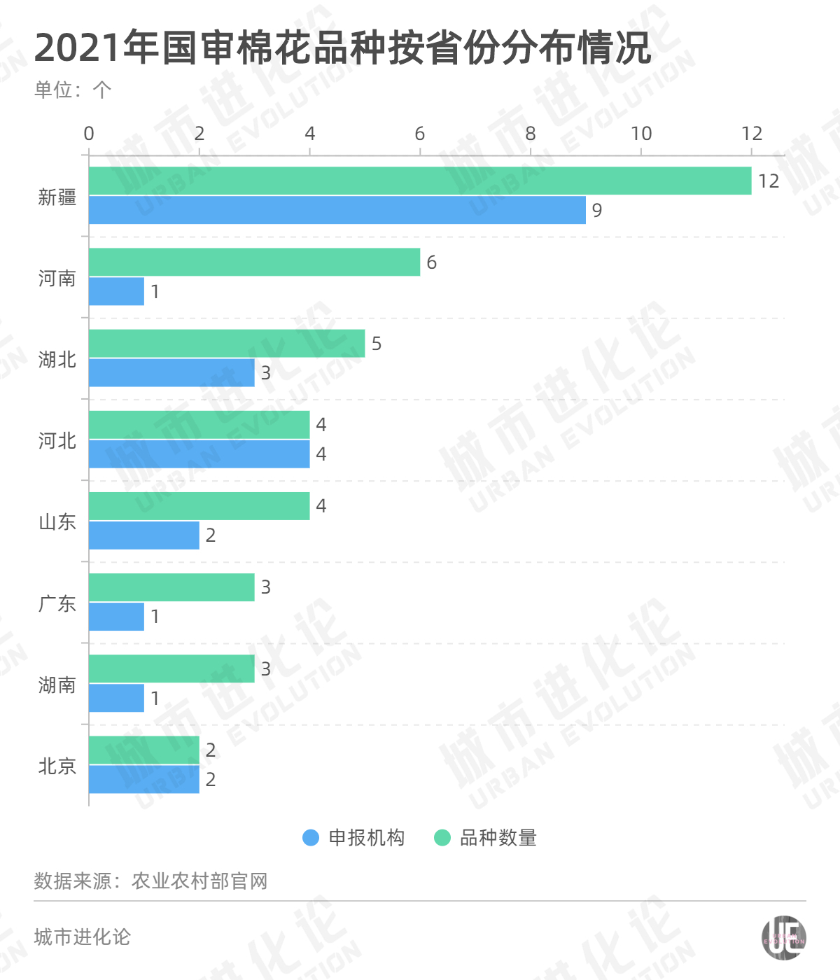 另一个颇受关注的作物——棉花,则是新疆育种的“主场”。从过审情况来看,新疆共有12个品种、涉及9家企业。值得注意的是,该数字占所有过审品种的30.8%,其他省份品种仅个位数。