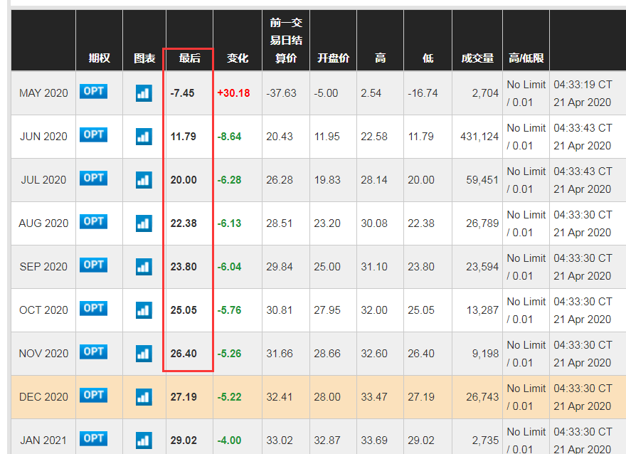 而昨日跌成负值的WTI 5月合约在今日早盘翻正后,午后再度跌成负值,截至北京时间18:00,报价仅为-7.5美元/桶。WTI 6月合约午后更是大跳水,跌幅一度超40%,跌破12美元/桶。