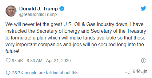 于是昨晚特朗普再掀“推特风暴” !特朗普表示已经指示政府关键人物制订一项计划,以向陷入困境的美国石油和天然气行业筹集资金,来应对目前历史性的原油价格暴跌。