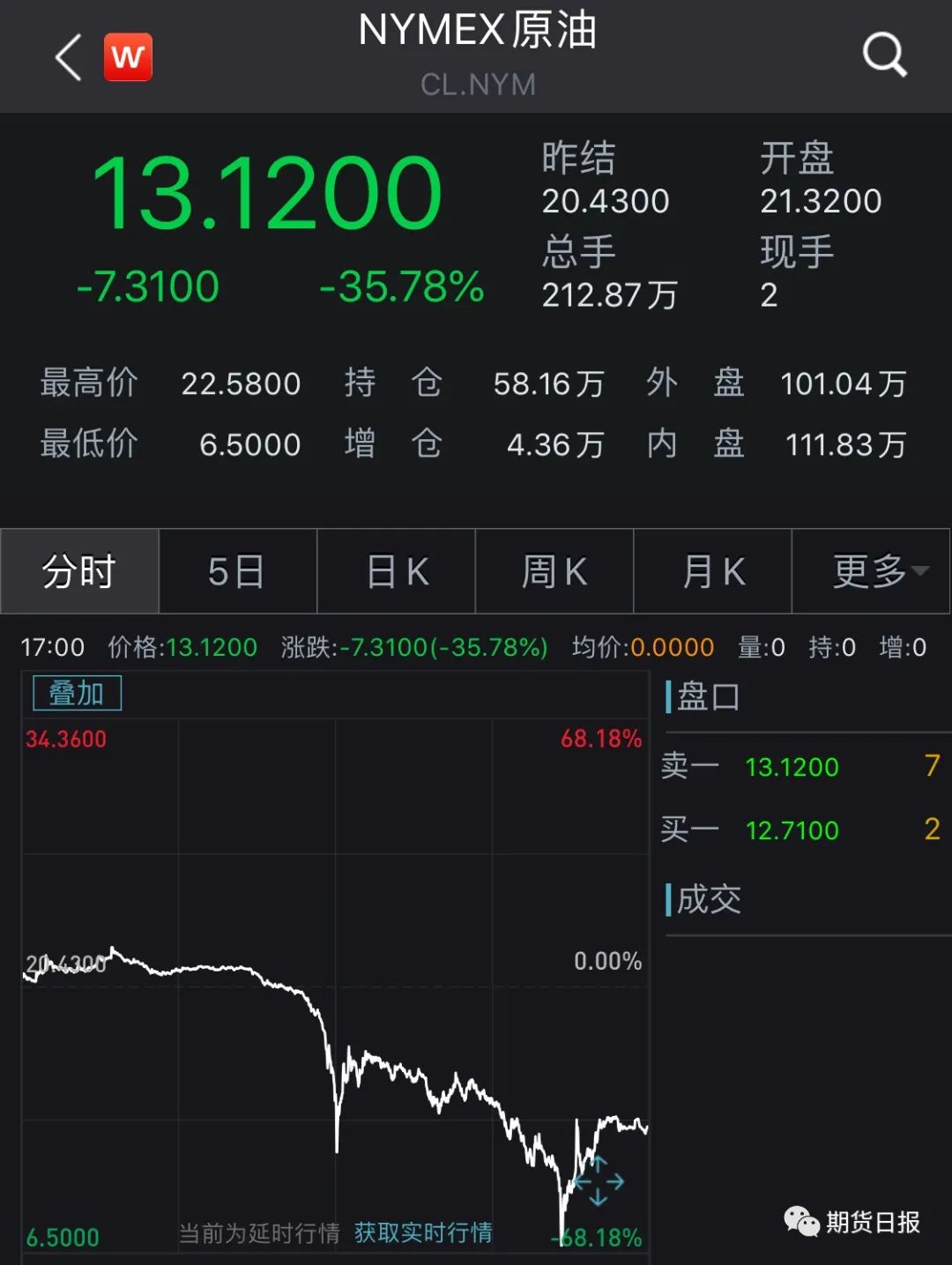 三次触发熔断!WTI原油6月合约盘中暴跌近70%