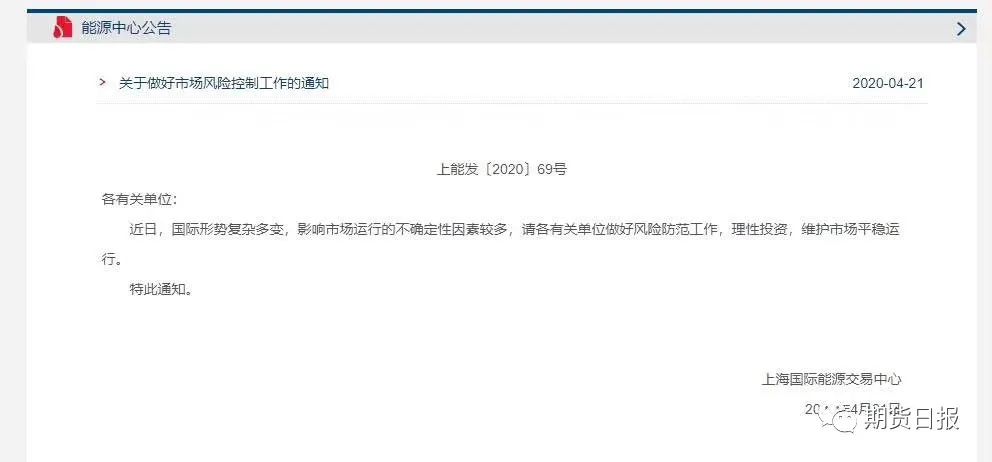 在这样的情况下,风险无疑是巨大的。也正是因为如此,4月21日,上期所子公司上期能源特意发公告,要求各相关单位做好相应的风险防范工作。至于投资者,他们也建议要理性投资。