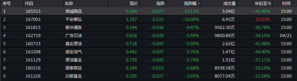 全天来看,场内基金跌幅榜前列几乎被油气基金占据。其中,信诚商品午后开盘即跌停,截至收盘未打开跌停,以10.11%的跌幅领跌油气基金及全部场内基金。