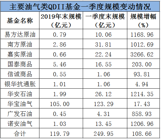 华安石油规模增幅同样较大,从1.99亿元增至26.12亿元,增长幅度超12倍。诺安紧随其后,一季度规模增幅同样超过12倍。油气易方达原油和南方原油两只原油QDII,今年一季度末的基金规模较去年四季度末分别增长11.68倍和10.13倍。