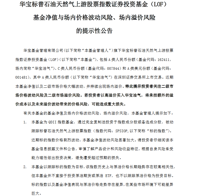 华宝油气最新发布公告称,近期基金净值以及二级市场价格大幅波动,并持续出现场内溢价。