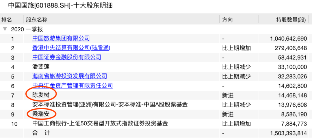 中国国旅(601888)4月22日晚间披露年报和一季报显示,截至今年一季度末,陈发树进入公司前十大股东名单,持股1446.81万股,持股比例0.74%,为第七大股东。此外,新进前十大股东的还有梁瑞安,持股858.6万股,为中国国旅第9大股东。