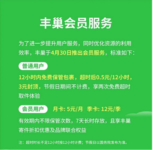 也就是说,如果未办理丰巢会员,且在非国务院法定节假日使用丰巢超过12小时的用户,将会被收取最少0.5元最多3元不等的费用。
