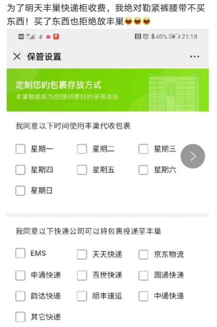 有网友直接选择用手投票,马上调整丰巢的保管设置,不再同意让丰巢代收包裹:
