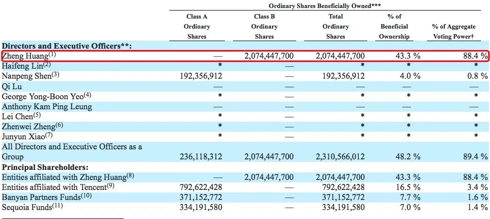据拼多多4月下旬发布的年报,截至2020年3月31日,黄峥持有拼多多20.74亿普通股,持股比例43.3%,拥有88.4%的投票权。