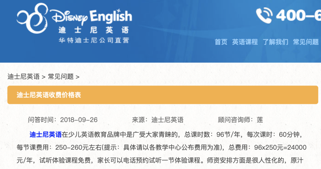 根据迪士尼英语官网显示,总课时数:96节/年,每次课时:60分钟,每节课费用:250-260元左右(提示:具体请以各教学中心公布费用为准),总费用:96x250元=24000元/年。
