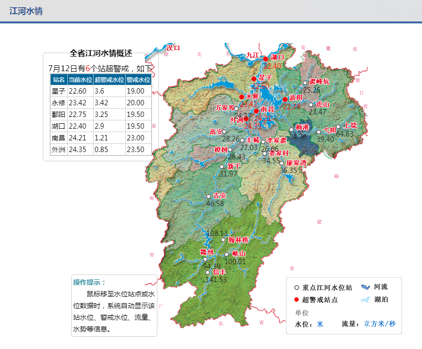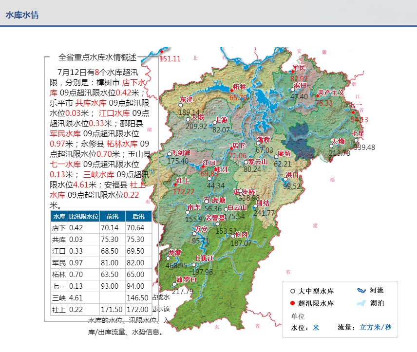 ▲江西省水利厅官网显示,7月12日有6个监测站江河水情超警戒线,8个水库超汛限。
