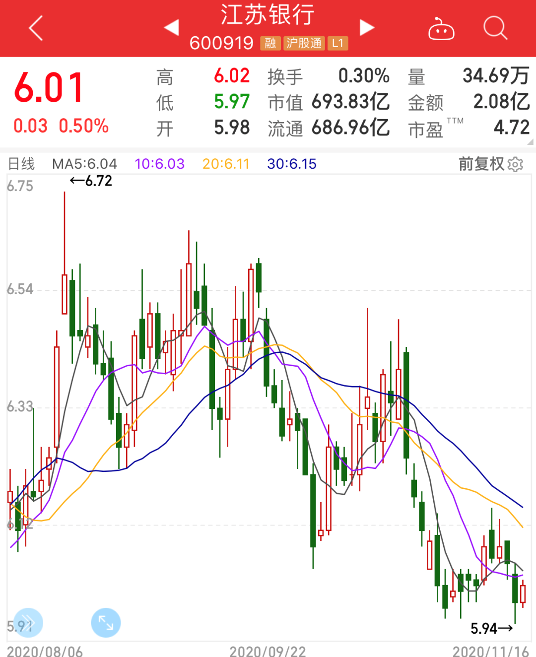 今年7月9日晚间,江苏银行披露配股方案。当日盘后江苏银行报收6.67元/股,但自7月1日以来的连续上涨,期间最高涨至近7元/股、已补回农历春节后疫情带来股价缺口。11月16日江苏银行盘后收6.01元/股,从配股方案发布到获监管核准区间跌幅10.83%;PB值为0.6025倍。