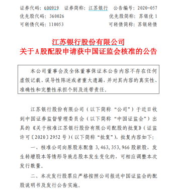 11月16日晚间,江苏银行公告称,该行近日获得的证监会相关批复显示:核准其向原股东配售不超过34.634亿股,发生转增股本等情形导致总股本发生变化的,可相应调整本次发行数量;本批复自核准发行之日起12个月内有效。
