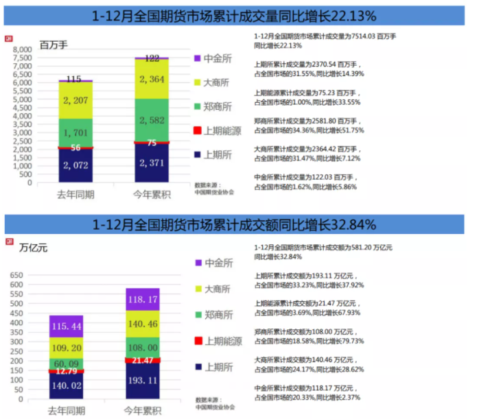 你好,2022!中国期货业协会最新统计资料表明,以单边计算,12月全国期货市场成交量为594960223手,成交额为447399.39亿元,同比分别下降23.00%和18.76%,环比分别下降15.70%和11.91%。1—12月全国期货市场累计成交量为7514025454手,累计成交额为5811988.35亿元,同比分别增长22.13%和32.84%。