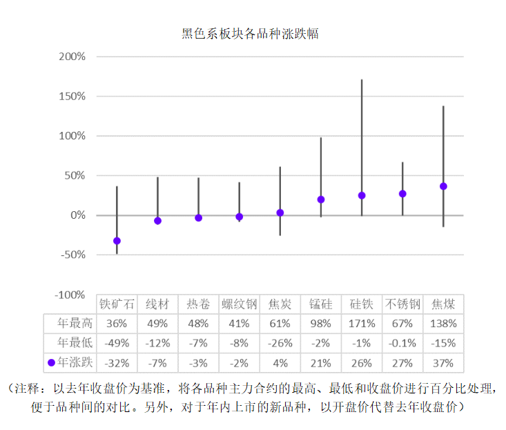 年度振幅前三的品种依次是动力煤(206.8%)、硅铁(172.46%)、焦煤(152.95%)。其中,振幅%=100%*(年最高-年最低)/去年收盘。