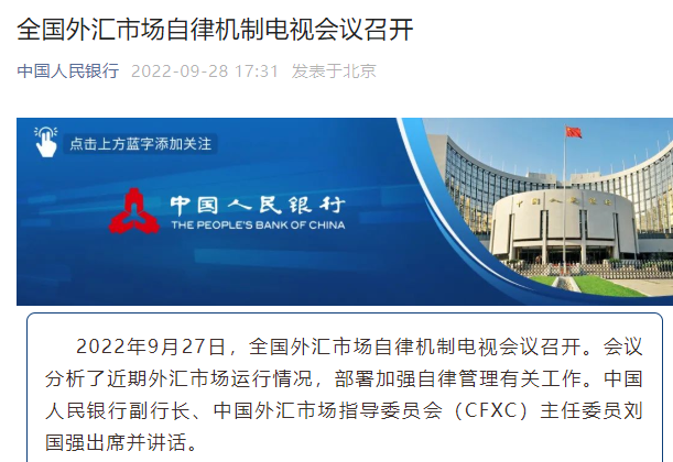 28日下午,央行官网发布消息,2022年9月27日,全国外汇市场自律机制电视会议召开。会议分析了近期外汇市场运行情况,部署加强自律管理有关工作。中国人民银行副行长、中国外汇市场指导委员会(CFXC)主任委员刘国强出席并讲话。