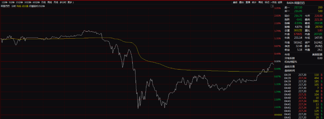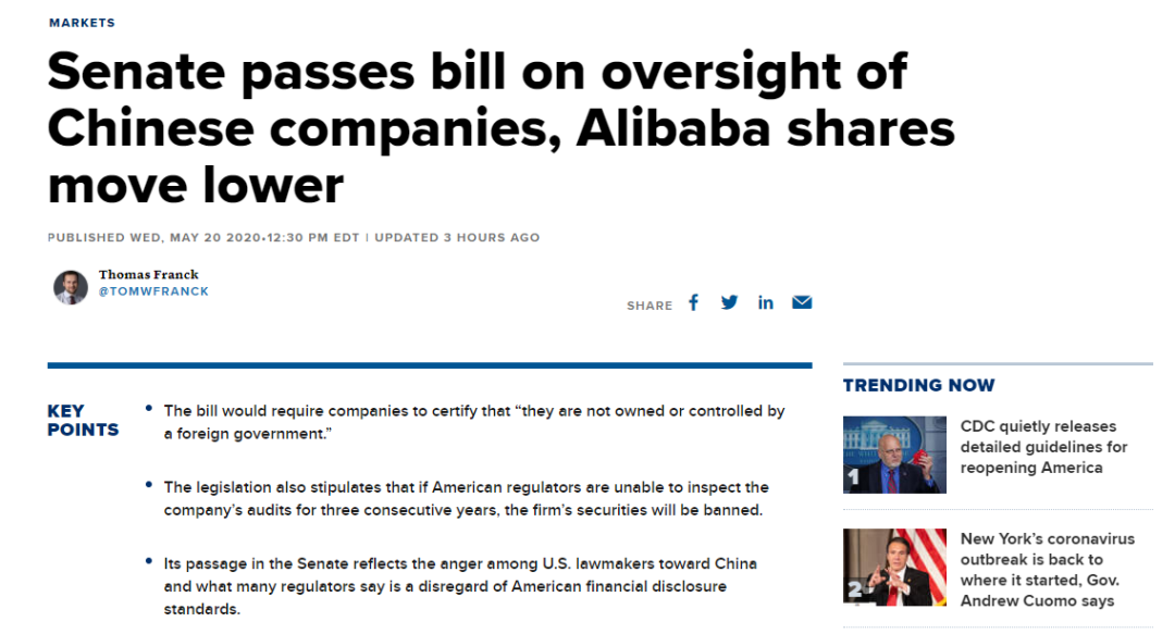 在上述法案通过之后,阿里巴巴等中概股迎来了一波跳水。