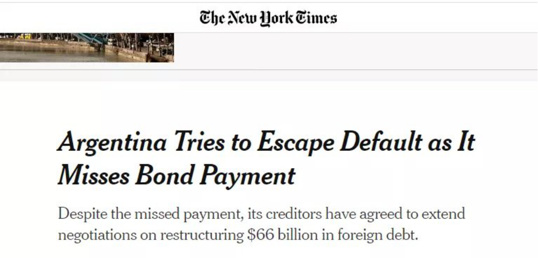 据纽约时报报道,当地时间5月22日,阿根廷未能偿付一笔5亿美元的到期债务利息,目前,政府与债权人正在谈判,以重组这项总额662亿美元的外债,报道说,债权人包括贝莱德、富达等主要资管公司,他们持有约167亿美元的阿根廷国际债, 而其他债权人还包括小型散户投资者。报道说,谈判将持续到6月2日,债权人考虑到阿根廷政府的谈判意愿,不会因为债务到期而提起诉讼。上个月,阿根廷政府公布了662.38亿美元的债务重组方案,要求减免36亿美元债务本金、减免379亿美元债务利息,以及延长3年债务偿还的宽限期,但遭到债权人拒绝。