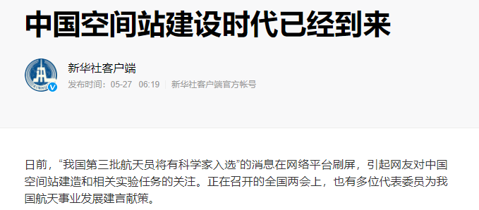 来自新华社的资料显示,日前,“我国第三批航天员将有科学家入选”的消息在网络平台刷屏,引起网友对中国空间站建造和相关实验任务的关注。