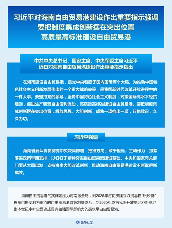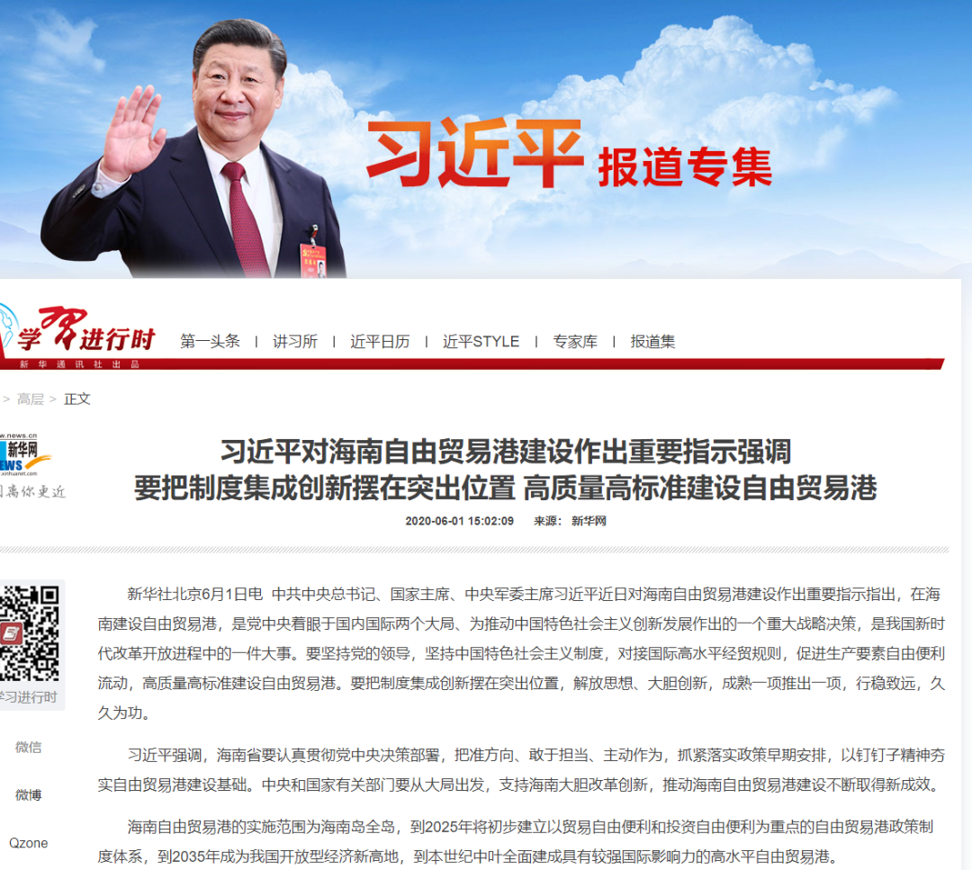 中共中央总书记、国家主席、中央军委主席习近平近日对海南自由贸易港建设作出重要指示指出,在海南建设自由贸易港,是党中央着眼于国内国际两个大局、为推动中国特色社会主义创新发展作出的一个重大战略决策,是我国新时代改革开放进程中的一件大事。