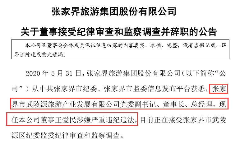 6月2日上午,张家界公告称,张家界市武陵源旅游产业发展有限公司党委副书记、董事长、总经理,现任本公司董事王爱民涉嫌严重违纪违法,目前正在接受张家界市武陵源区纪委监委纪律审查和监察调查。