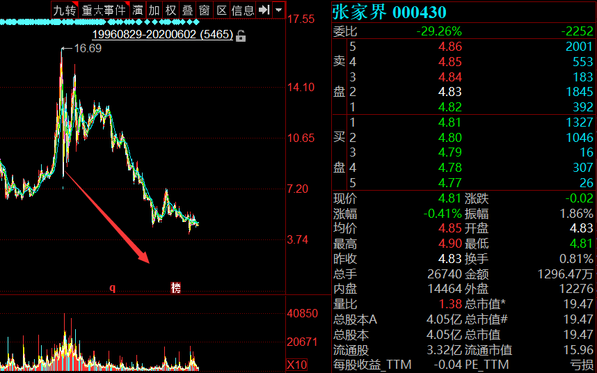 张家界的股价也从2015年的高位16.69元,下跌超7成。