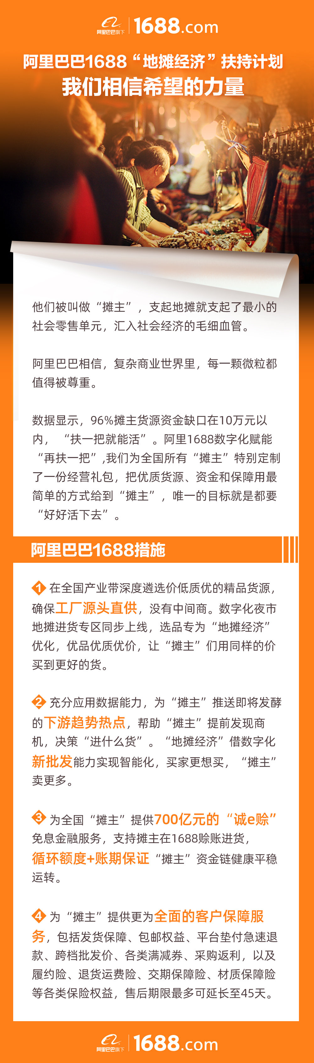 而作为互联网巨头的阿里,在扶持“地摊经济”方面也是大招不断。5月29日,新批发平台阿里1688发布“地摊经济”扶持计划,计划提供超过700亿元的免息赊购,支持摊主在1688赊账进货,商品卖出的资金再用于还款和新一轮的采购,赊购额度最高200万元。通过提供源头好货,以及数据智能、金融扶持、客户保障等多个维度,为超3000万“摊主”提供全方位的进货和经营支持。