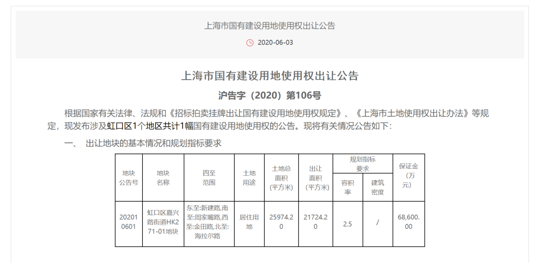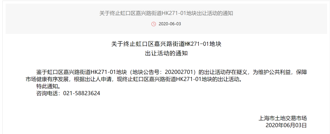 6月3日,上海土地市场官网发布了一则公告称,鉴于虹口区嘉兴路街道HK271-01地块(地块公告号:202002701)的出让活动存在疑义,为维护公共利益,保障市场健康有序发展,根据出让人申请,现终止虹口区嘉兴路街道HK271-01地块的出让活动。