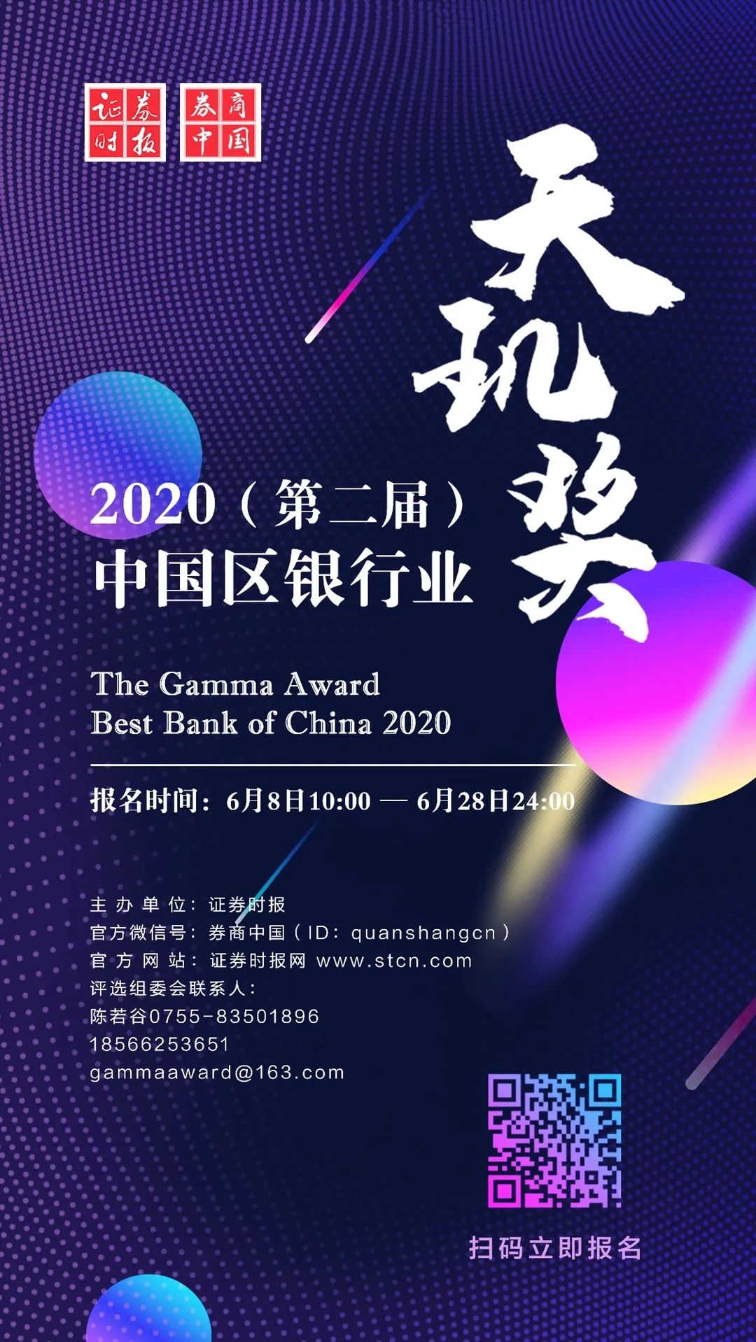 由证券时报主办的“2020(第二届)中国区银行业天玑奖”评选活动于6月8日正式启动,报名时间为6月8日10:00到6月28日24:00,申报地址为: