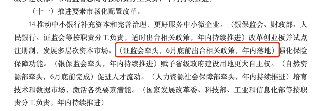 昨日(6月11日)傍晚,《国务院国务院关于落实<政府工作报告>重点工作部门分工的意见(国发〔2020〕6号)》明确指出,改革创业板并试点注册制,发展多层次资本市场,由证监会牵头,6月底前出台相关政策,年内落地。