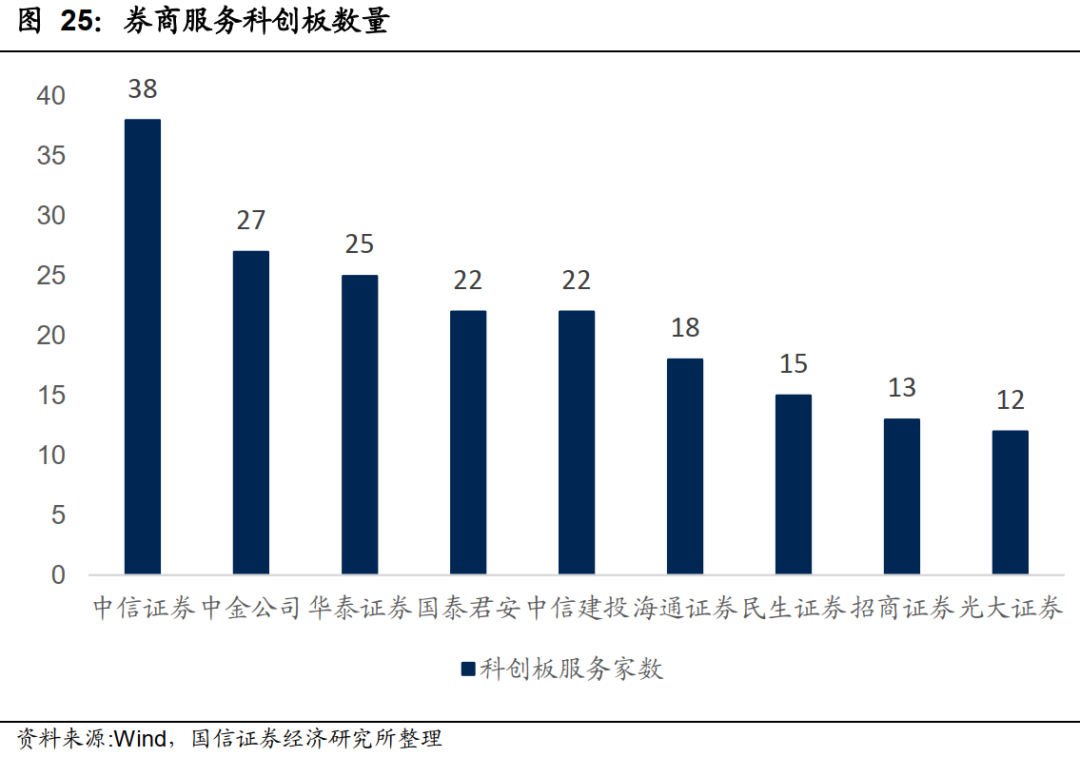 在服务科创板的券商中, CR5 为 45.05%, CR10 为 69.07%。预计随着注册制推进, 大型龙头券商获得的投行业务利润增量将更加显著,行业集中度将进一步提升。