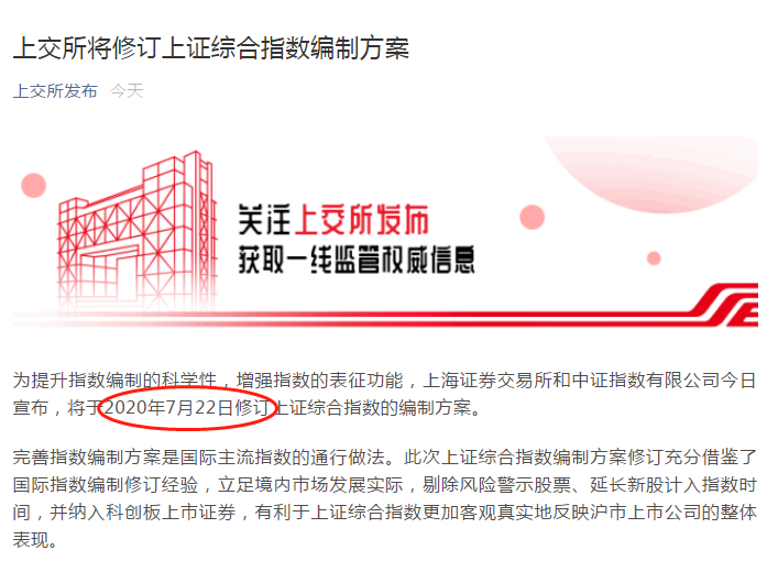 刚刚,上海证券交易所发布关于修订上证综合指数编制方案的公告,将于7月22日修订上证综合指数的编制方案。