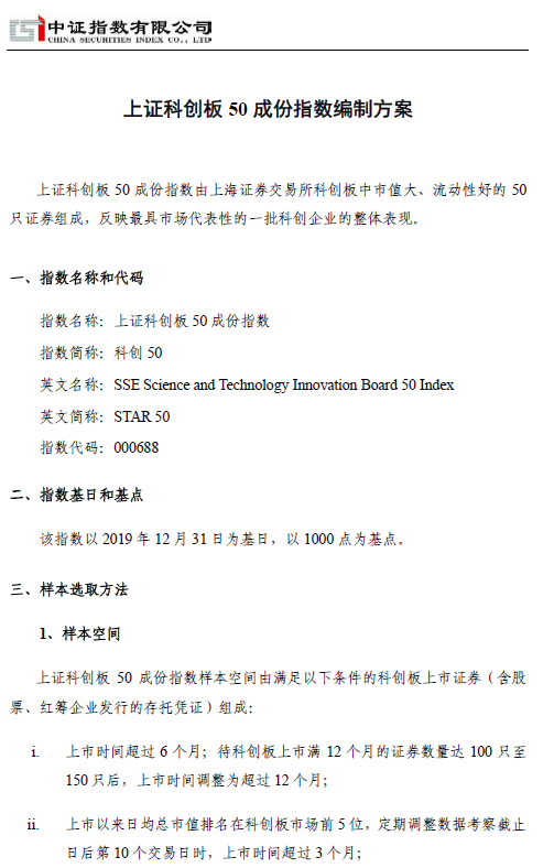 指数编制借鉴了境内外市场成熟经验,并充分考虑科创板制度特征及客观情况。指数以2019年12月31日为基日,基点为1000点。样本空间包含科创板上市的股票及红筹企业发行并在科创板上市的存托凭证。考虑到科创板客观发展情况及制度特点,现阶段新股上市满6个月后纳入样本空间,待科创板上市满12个月的证券达100只-150只后调整为上市满12个月后纳入,另外对大市值公司设置差异化的纳入时间安排。经流动性筛选后,以市值指标进行选样,实现对市场的客观表征。采用自由流通股本加权,为避免个股权重过大对指数的影响,设置一定比例的个股权重上限。为适应板块快速发展阶段的特点,及时纳入代表性上市公司,建立季度定期调整机制。