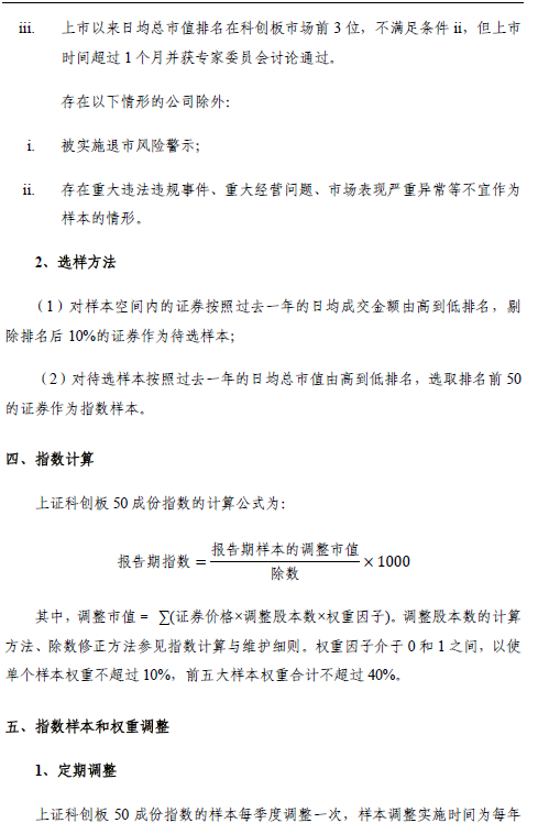 三是选样方法。市值规模和流动性是国际代表性成份指数最基本与核心的标准,借鉴境内外代表性成份指数经验,结合科创板市场发展客观情况,剔除过去一年日均成交金额位于样本空间排名后10%的证券后,选取日均总市值排名靠前的50只证券作为“科创50”指数样本,能够在保证样本流动性的同时,实现较好的代表性。