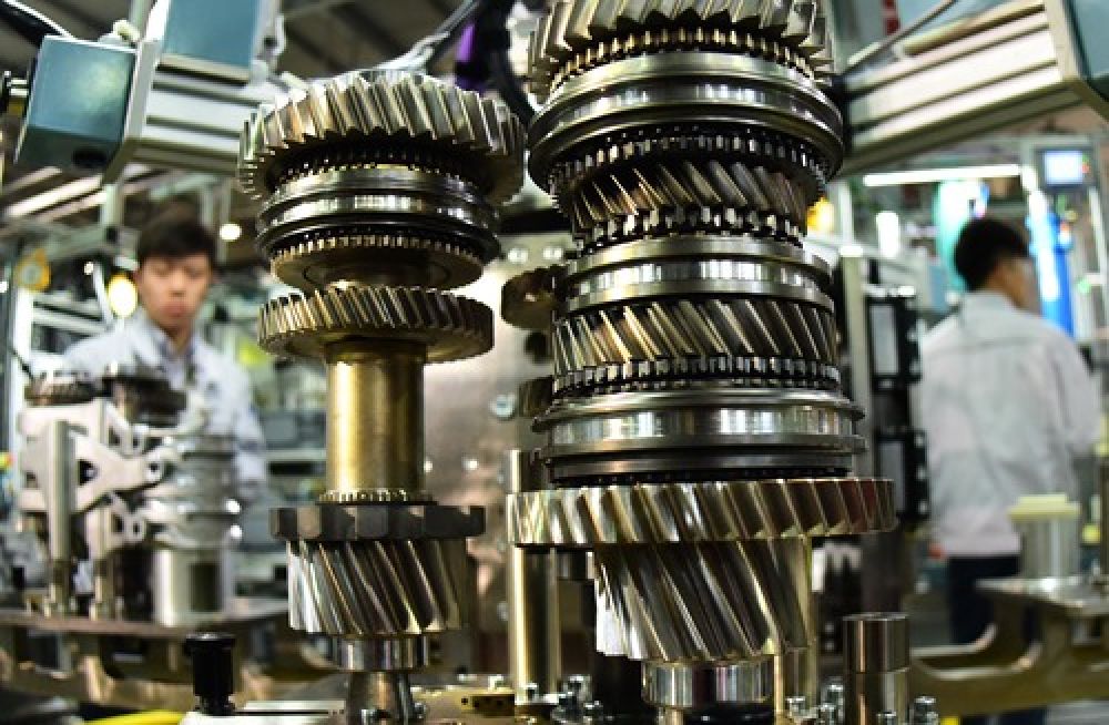 工人在湖北武汉东风格特拉克汽车变速箱有限公司生产线上工作。(新华社记者程敏 摄)