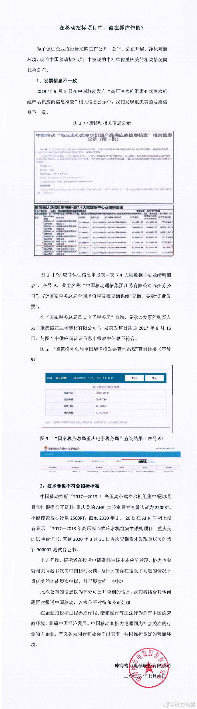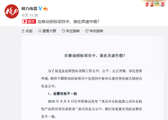 7月6日,格力电器官方微博发文公开质疑美的在中国移动招标过程中弄虚作假,包括发票信息不一致、技术参数不符合招标标准两点。