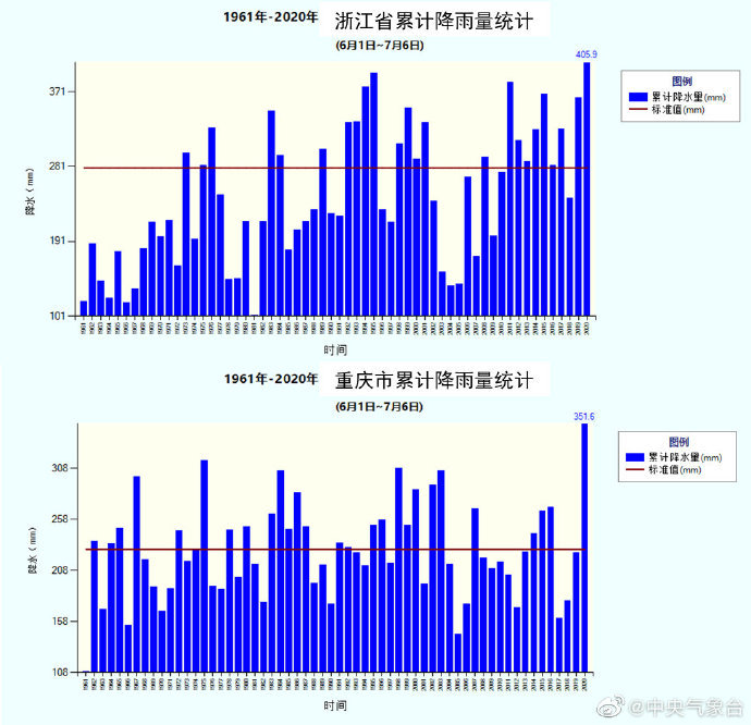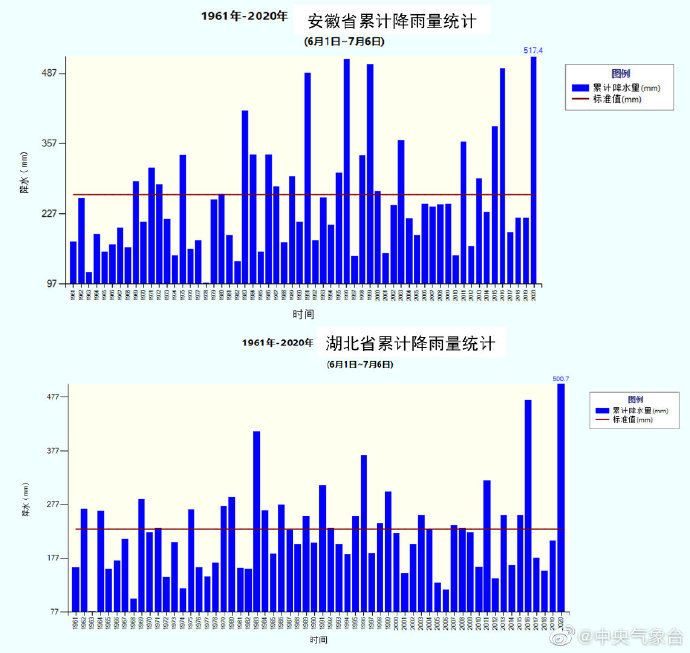 据中央气象台7月7日消息,气象监测显示,今年6月1日以来,安徽、湖北、浙江、重庆4省(市)累计降雨量为1961年以来同期最多,安徽、湖北2省的平均降雨量已超过500毫米。4省(市)降雨量为近60年以来最高。