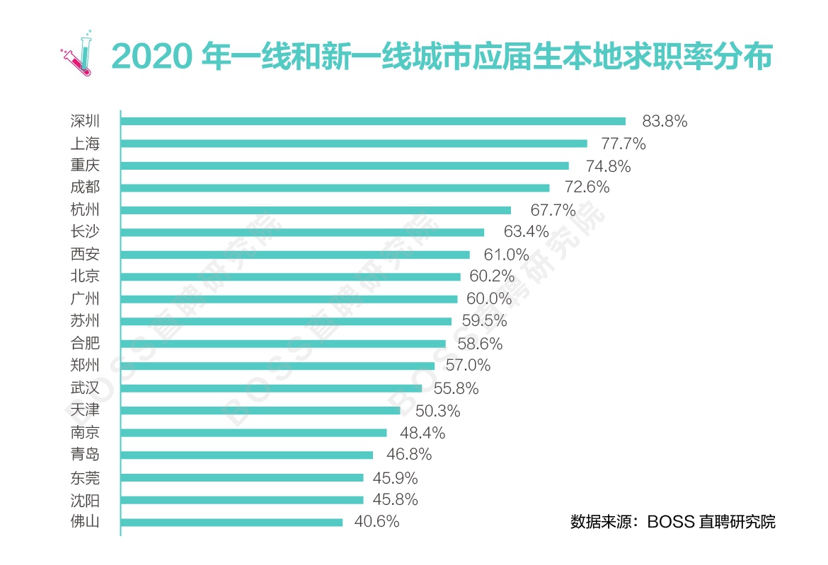 随着国内疫情得到控制,人才流动逐步恢复,截至六月底,一线和新一线城市的应届生本地求职率已经恢复到2019年同期水平。其中,深圳的应届生本地求职率达到83.8%,高居第一位。由于疫情严控时间长且出现了反复,北京的应届生本地求职率较2019年同期降低了6.5个百分点。