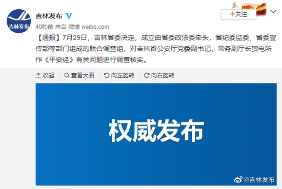 7月29日,吉林省委决定,成立由省委政法委牵头,省纪委监委、省委宣传部等部门组成的联合调查组,对吉林省公安厅党委副书记、常务副厅长贺电所作《平安经》有关问题进行调查核实。