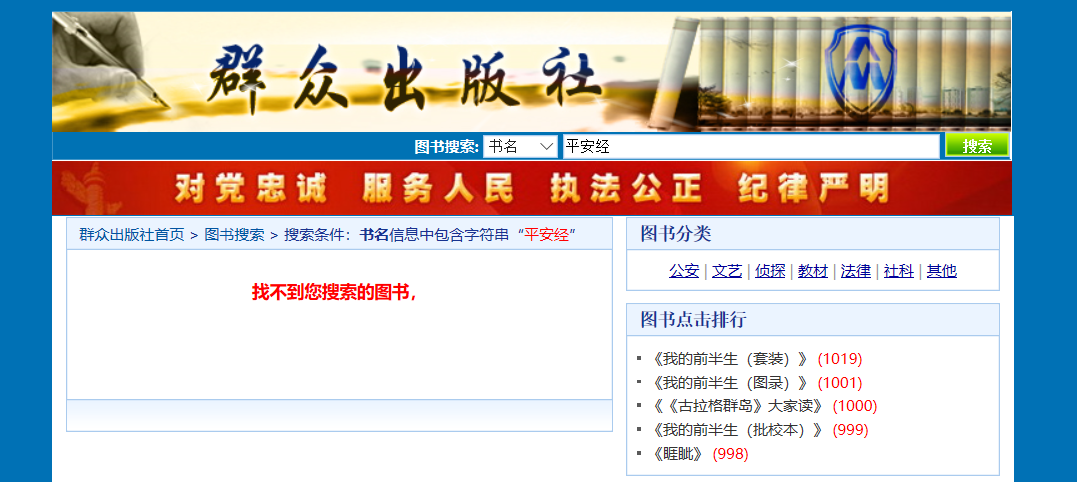 记者今天再度搜索群众出版社官网,发现已经找不到《平安经》的图书信息。29日中午,记者在天猫、淘宝、京东、当当和孔夫子网分别检索关键词,也均未出现该书商品链接。