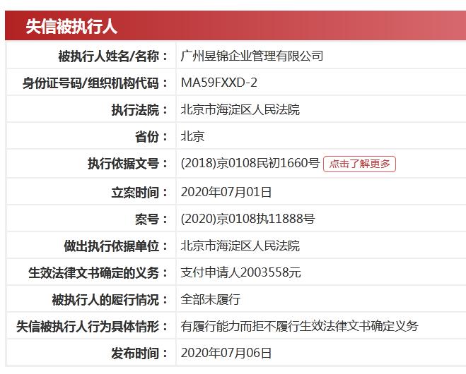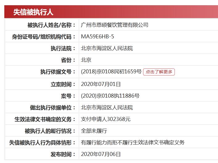 中国执行信息公开网显示,广州昱锦企业管理有限公司、广州市恩硕餐饮管理有限公司被列为失信被执行人,具体为有履行能力而拒不履行生效法律文书确定义务,执行标的分别是200.36万元、30.24万元。