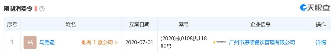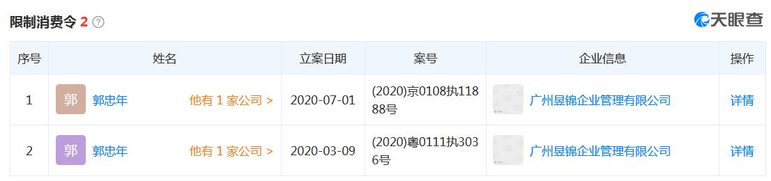 另据天眼查APP数据显示,两公司相关案由分别为姓名权纠纷和肖像权纠纷,原告为均为吴亦凡。另外,除被列为失信被执行人外,广州昱锦企业管理有限公司及其法定代表人郭忠年、广州市恩硕餐饮管理有限公司及其法定代表人马路遥还被限制高消费。