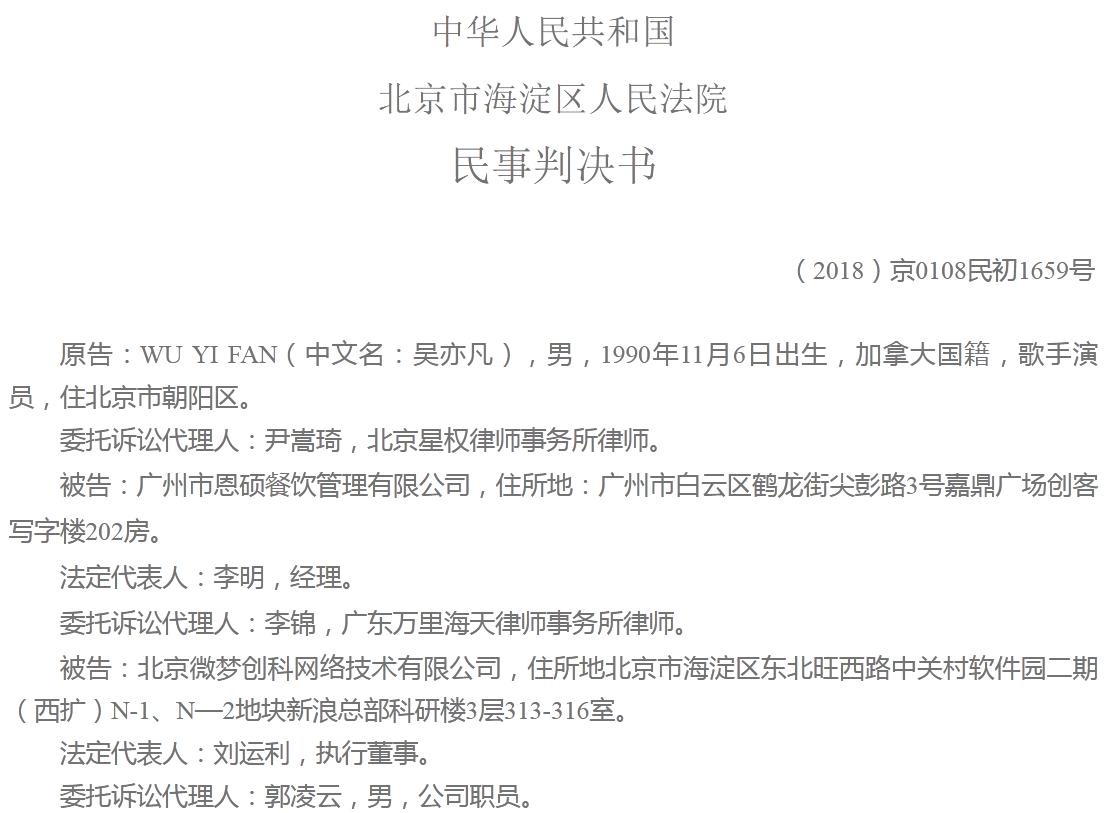 据5月4日北京法院审判信息网披露的民事判决书,吴亦凡诉广州市恩硕餐饮管理有限公司、北京微梦创科网络技术有限公司侵犯肖像权,包括广州恩硕公司在未经授权的情况下擅自在其经营的ENCHA恩茶实体店、官方认证的微信公众号“ENCHA恩茶”、微博中使用原告大幅照片、姓名为自身所经营的茶饮项目进行商业推广宣传等。