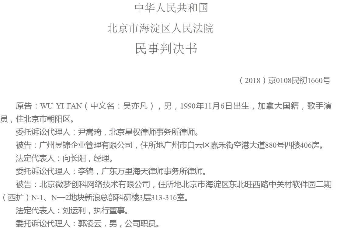 此外,同日(5月4日),北京法院审判信息网公布的另一份民事判决书显示,吴亦凡诉广州昱锦企业管理有限公司、北京微梦创科网络技术有限公司侵犯肖像权,包括在未经授权的情况下,两被告擅自在其经营的末茶实体店、官方网站“MOOTEA末茶”、官方认证的微信公众号“MOOTEA末茶”、官方微博“末茶MOOTEA官微”中使用吴亦凡大幅照片为自身所经营的茶饮项目进行商业推广宣传等。