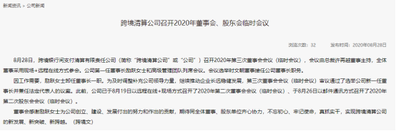 8月28日,跨境银行间支付清算有限责任公司(简称“跨境清算公司”)召开2020年第三次董事会会议(临时会议),会议由总裁许再越董事主持,全体董事采用现场+远程在线方式参会。公司第一任董事长励跃女士和高级管理团队列席会议。会议选举时文朝董事接任公司董事长职务。