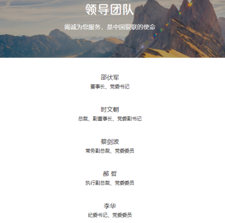 券商中国记者看到,银联官网尚未更新银联领导团队名单,时文朝仍居于其原任职的总裁、副董事长、党委副书记职务。