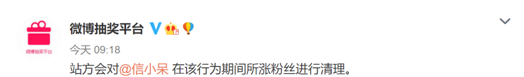 10日,微博抽奖平台官方账号表示,站方会对@信小呆在该行为期间所涨粉丝进行清理。