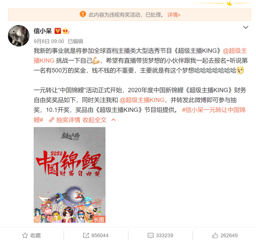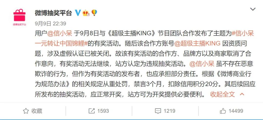 据微博抽奖平台官方账号介绍,微博用户@信小呆于9月8日与《超级主播KING》节目团队合作发布了主题为“信小呆一元转让中国锦鲤”的有奖活动。随后该合作方账号@超级主播KING 因资质问题,涉及虚假认证已被关闭。故该有奖活动的合作方、品牌方以及商家取消了合作意向,有奖活动无法继续。