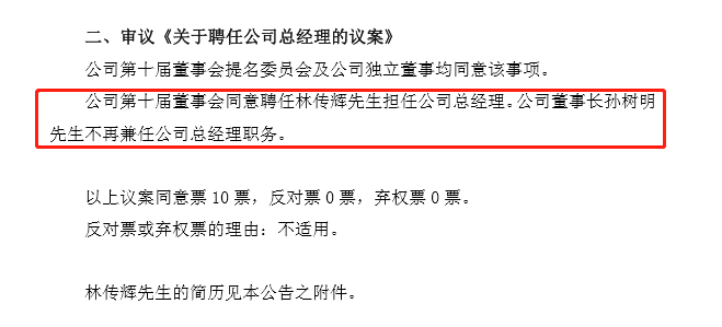 二、审议《关于聘任公司总经理的议案》,公司第十届董事会提名委员会及公司独立董事均同意该事项,同意聘任林传辉先生担任公司总经理。公司董事长孙树明先生不再兼任公司总经理职务。